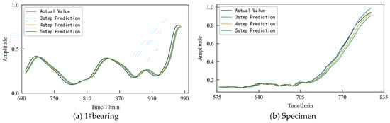 In practical applications, the number of predicted steps can be appropriately increased according to demand. Figure 34 shows the prediction results obtained using the TCN model in the prediction time period when the prediction steps are 3, 4, and 5, respectively. It can be seen that: (1) In the early stage of prediction, the difference between the predicted values under different prediction step sizes is small and close to the actual value. (2) With the passage of time, the variation range of the HI increases, and the predicted value begins to deviate from the actual value. (3) In the later stage of prediction, the prediction error increases. The larger the prediction step size, the larger the error.