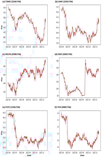 Stock price trend of (a) TSMC, (b) UMC, (c) DELTA, (d) EMC, (e) FCFC, and (f) YFH from 1 June 2022 to 18 November 2022.