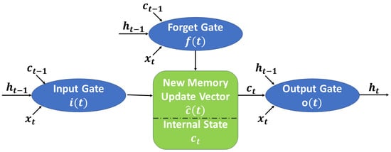 Let be the input at time t. We also use and to denote the previous hidden state and cell state, respectively, at time . The initial stage in the LSTM architecture is the forget gate. This gate plays a crucial role in determining the relevance of elements within the cell state, essentially acting as the neural network’s filter for long-term memory. It makes this determination based on information from both the prior hidden state and the new input data. The network operating within the forget gate is trained to assign values close to 0 to information it deems irrelevant and values close to 1 to information it considers relevant. This process allows the LSTM to selectively retain or discard information from the cell state, enabling it to focus on what is most important for its learning objectives. The calculation method of the forgetting probability is given by