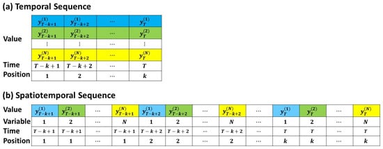 Multivariate time series data. (a) Standard temporal input sequence. (b) Flattened spatiotemporal input sequence.