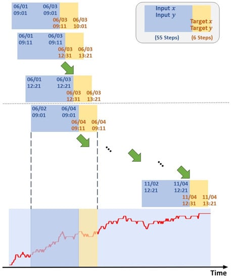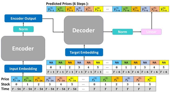 In order to avoid affecting the performance of the model due to cross-day forecasting, we use daily moving windows, as shown in Figure 4, to define the training set and testing set. Given any trading day from 3 June 2022 to 4 November 2022, we take time points 9:01, 9:11, …, and 12:21 as starting points. The fifty-five time points forward from this starting point are regarded as the input sequence, and we could predict the stock price (target sequence) every ten minutes in the next hour (a total of six steps). Let us take 9:01 as an example. The model can predict the stock price in the next 6 steps, 9:11, 9:21, …, and 10:01. Until we sample the last time point at 12:21, the model will predict the stock prices at 12:31, 12:41, …, and 13:21. This process, as shown in Figure 5, is repeated until all the training data have been entered into the model, a total of 2205 sequence data. At the same time, we use a total of ten trading days from 7 November 2022 to 18 November 2022 as the testing data.