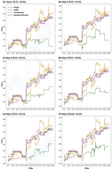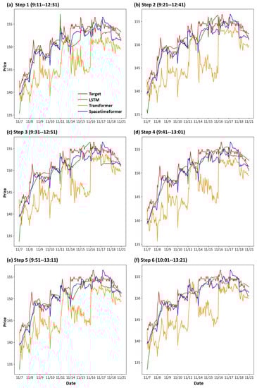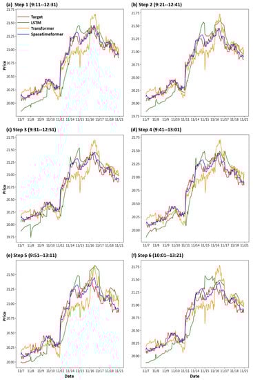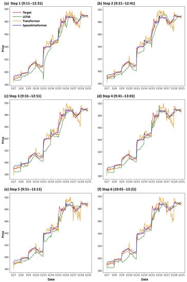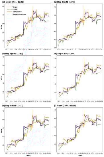 First, we draw the trend chart of stock price predictions, as shown in Figure 6, Figure 7, Figure 8, Figure 9, Figure 10 and Figure 11, to show the performance results of different models. In all figures, the red line represents the real value, the blue line represents the Spacetimeformer model, the orange line represents the Transformer model, and the green line represents the LSTM model. Among them, “Step i”, i = 1, 2, …6, represents the ith step predictions through each model. At the same time, we use MAPE (shown in Table 3, Table 4, Table 5, Table 6, Table 7 and Table 8) and RMSE (shown in Table 9, Table 10, Table 11, Table 12, Table 13 and Table 14, respectively) to evaluate the error between the stock price predicted by each model and the real stock price. The trend chart, MAPE, and RMSE help us to more comprehensively evaluate the performance of stock price prediction between models.