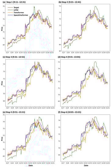 The research results show that the Spacetimeformer model with the space–time concept performs better in stock price prediction than the Transformer and LSTM models. The Spacetimeformer model can continuously capture important trend changes in stock price forecasts and provide relatively stable forecast results. Furthermore, the Spacetimeformer model’s predictions for the next ten minutes, twenty minutes, and even one hour are very close to the true values. This highlights the excellent performance of the Spacetimeformer model in both short- and long-term predictions. In contrast, the predictions of the Transformer and LSTM models at different time points might vary, indicating a less stable performance. This also further demonstrates the superior performance of models based on the Spacetimeformer architecture in both short- and long-term predictions. The experimental design of this study adopts a daily moving window approach to avoid the problems of cross-day forecasting and using long-term models for prediction. This allows us to more accurately assess model performance and leverage the adaptive nature of deep learning. In summary, the Spacetimeformer model combined with daily moving windows demonstrates a superior performance in stock price prediction compared to the Transformer and LSTM models, indicating the significance and value of spatiotemporal concepts for predictive modeling.