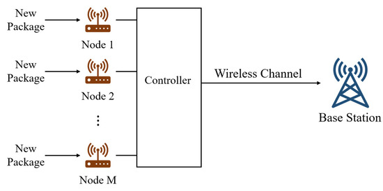 M nodes transmit random status updates to a base station (BS), as illustrated in
