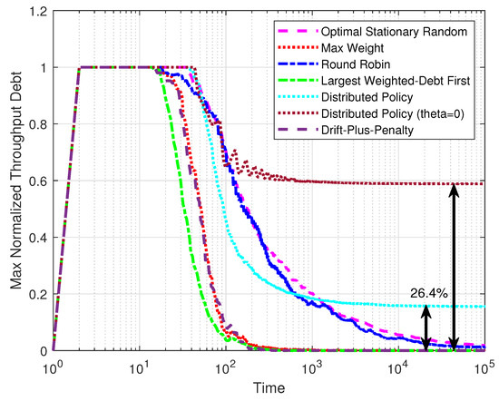 Figure 5 shows the performance of the throughput of the policies over time. The max normalized throughput debt was defined as