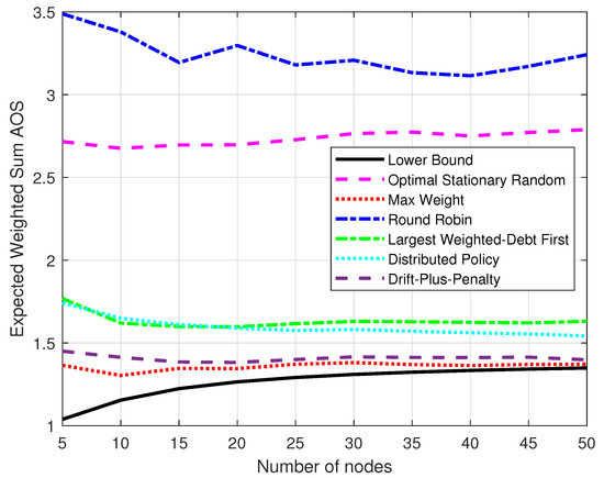 Figure 6 compares the expected weighted-sum AoS of five policies over time and the lower bound defined by Equations (