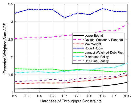 . When the hardness of satisfying the throughput constraints increased, each policy had to prioritize the throughput and had fewer resources available to reduce the AoS. Thus, it can be seen that the gap between the max-weight, the drift-plus-penalty, and the largest-weighted-debt-first policies and the gap between the optimal stationary randomized and round robin policies decreased with the growth in