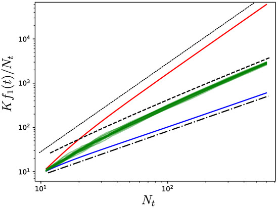 Evolution of the Kirchhoff index divided by the number of nodes when a new node is connected to a single existing one at each new iteration. The initial network has ten nodes, and is obtained from a Watts–Strogatz rewiring procedure using nearest neighbors coupling [29]. The green curves correspond to twenty realizations starting from this initial network and recursively adding nodes while selecting the existing nodes to which they connect uniformly and at random. For large , the green curves follow the scaling of Equation (14). The red and blue curves are obtained by selecting the least and most central existing nodes, respectively, in each iteration. When is large, the curves follow the scalings in Equations (16) and (18). The dotted, dashed, and dash-dotted black lines indicate , , and , respectively.
