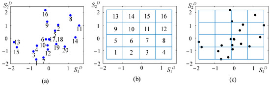 The construction process of adaptive grid space will be demonstrated using a 2-dimensional dataset, as shown in Figure 1. The dataset contains 16 instances conforming to Gaussian distributions, which are marked from 1 to 16 in Figure 1a. Then, the spatial extent of the dataset is divided into a 4 × 4 grid through Algorithm 1 when the resolution coefficient is set as 0.8, as shown in Figure 1b. Each cell has a different number of instances in Figure 1c, and there are 4 empty cells. The meshing results of the 2-dimensional dataset, cell number, location, density, and members of each nonnull cell, are listed in Table 1.