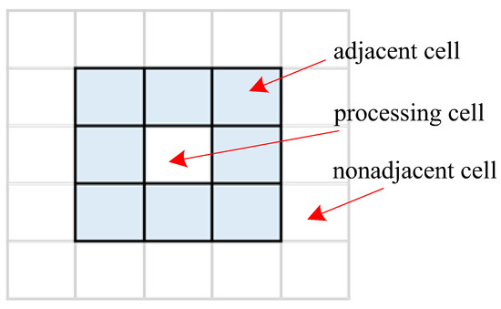 The clustering is accomplished by using adjacent grid searching. In the grid space , the adjacent cells of a cell is defined as whose locations are