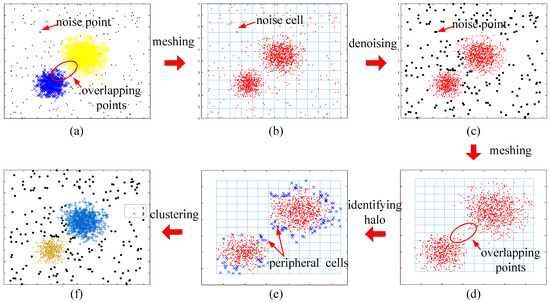 All of the above clustering methods deal directly with data points one by one. As a result, the time complexity is at least O(N), and thus, they are limited to processing large-scale datasets. This problem can be solved by grid-based clustering methods [15,16,17,18,19,20] because the number of grids is independent of the scale of the dataset. Representative grid-based clustering algorithms include GRIDCLUS [15], STING [16], WaveCluster [17], CLIQUE [18], optimal grid-clustering [19], and GDILC [20]. Despite the high efficiency of grid-based methods in processing large-scale data points, some drawbacks also exist in these algorithms. GRIDCLUS and STING could not provide high clustering accuracy when clustering datasets with arbitrary shapes. It is difficult for WaveCluster to be used for datasets with three or higher dimensions. CLIQUE and optimal grid-clustering are specially designed for high-dimension datasets. However, CLIQUE could only partition the dataset in which the clusters do not overlap with each other, and optimal grid-clustering could only find the hyperspherical clusters. GDILC needs the information of each data point to construct the grid space, which greatly reduces algorithm efficiency.
