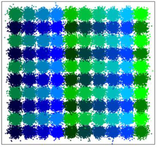 In this section, a dataset [35] with 15 strongly overlapping clusters is selected to test clustering performance on datasets with high overlap between classes. Table 14 shows the best-performing values of input parameters selected for the algorithms in Test XI. The original distribution of the dataset and the clustering results are shown in Figure 10a–f. The results show that only CAGS and CFSFDP could successfully identify all 15 clusters. For DBSCAN, WaveCluster, and FDGB, clusters can only be identified when the halo data are processed as noise data. Thus, they are ineffective for this kind of dataset. For k-means, only when the input number of clusters is 14 can each cluster be well identified.