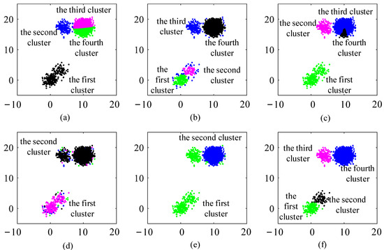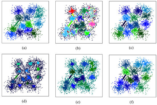 Distribution and clustering results of the dataset with high overlap between classes. (a–f) Clustering results obtained using k-means, DBSCAN, CFSFDP, WaveCluster, FDGB, and CAGS, respectively.