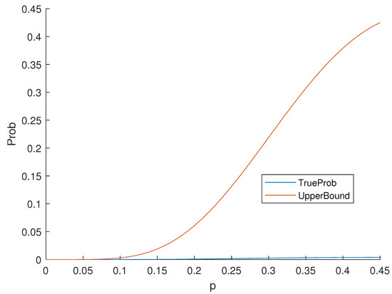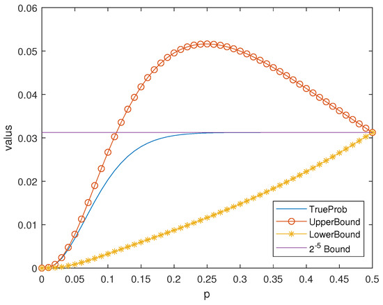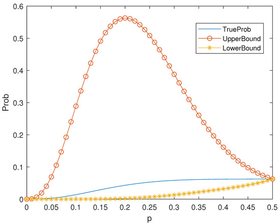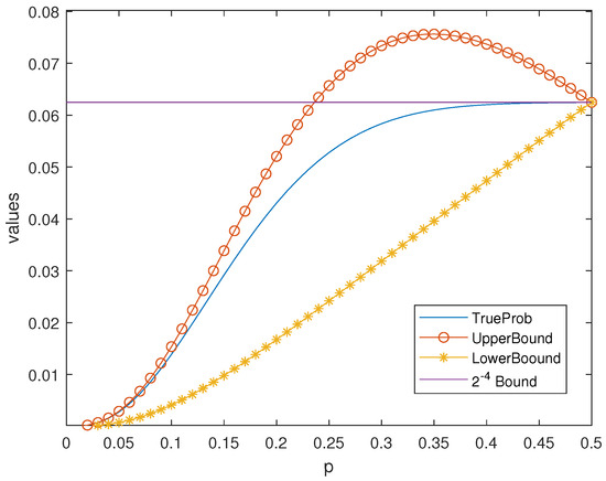 For a binary linear code, if the all-one vector is a codeword, then . So, Theorem 2 can be applied to many codes, for example, Hamming codes. It is known that the binary Hamming code is a linear code. The distance distribution of the Hamming code is listed in Table 1. According to Theorem 2, the values of the bounds and true probability can be seen in Figure 1.