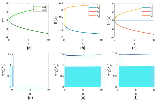 This leads to three eigenvalues, whose real and imaginary parts are shown in Figure 1b,c according to parameter a. For the fractional-order systems, the equilibrium point is asymptotically stable if and only if