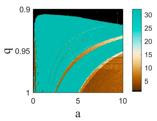 In order to represent the simultaneous effect of parameter and fractional order on the system’s dynamics, the 2D bifurcation diagram is plotted in Figure 4. In this figure, the period of oscillations of the system is shown by color. The blue region represents the chaos region, the brown tone represents the periodic region, and the black area shows an oscillation death state. It is evident that as the fractional order decreases from , the chaotic region is extended, and the periodic region starts in a larger a value. As decreases from , the oscillation death state is formed. For , the oscillations disappear completely.