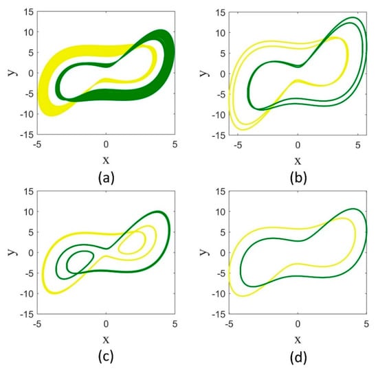 The model dynamics are considerably impressed by changing the derivative order to fractional. To represent this, the bifurcation diagrams of the model according to parameter are obtained for different orders . The result is shown in Figure 2. The bifurcation diagram of the original model () is illustrated in Figure 2a. The Sprott-B system has symmetry around the and variables. For some values of parameter a, the system’s attractor is symmetric, and for some values, there are two symmetric coexisting attractors. The bifurcation diagram for the symmetric coexisting attractors of the system is shown with green and yellow colors for initial conditions and . The bifurcation diagrams for fractional orders , and are shown in Figure 2b,c. It is observed that the region of chaotic dynamics is extended when considering the fractional-order derivatives. Moreover, the largest periodic window, which is [] in , enlarges and moves to larger values by decreasing the derivative order. The largest periodic window for is within [], that for is within [], and that for is within [].