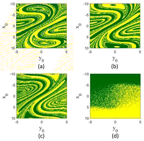 Basins of attraction of coexisting attractors of Sprott-B system for different derivative orders. (a) ; (b) ; (c) ; and (d) . The green and yellow colors refer to two coexisting attractors.