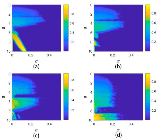 Normalized synchronization error of two coupled Sprott-B systems in 2D parameter plane () for different derivative orders. (a) , (b) , (c) , and (d) . The synchronization region is shown by dark blue color.