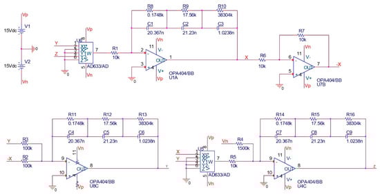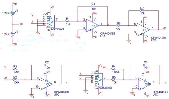 The implementation of fractional-order chaotic systems is of particular importance in practical applications. In this subsection, firstly, the electronic circuit of the integer-order Sprott-B system is implemented in the OrCAD-PSpice environment. Then, the design of the fractional-order circuit is explained. Common electronic components such as the resistor, capacitor, and OPAMP are used, and AD633 is used as a multiplier. The system equations using electronic components can be written as follows: