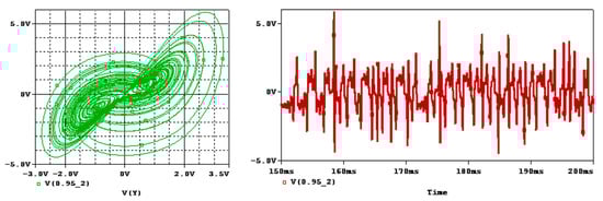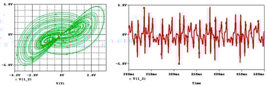 where the parameter a of the system can be adjusted by choosing the proper . The circuit elements can be chosen as , , , and for . Also, is chosen. The schematic of the integer-order circuit is shown in Figure 8. The time series and attractor of the system by setting zero initial conditions for the capacitors are shown in Figure 9, which match with the simulation results.