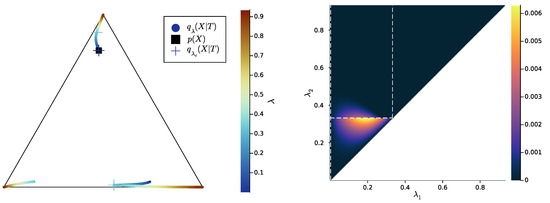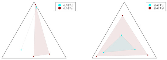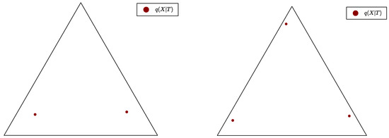 Examples of distributions , visualised as families of points on the source simplex , where, here, . Each of the triangle’s vertices represents the Dirac probability of some . The bottleneck’s effective cardinality is on the left and on the right.