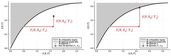 More generally speaking, the link between successive refinement and the IB theory of deep learning [49,50,51,52,53,54,55,56] has been noted since the inception of the latter research agenda [49], and, besides in [46], it was also further developed in [57]. Section 4.2 makes clear in which sense our results are relevant to this line of research. In particular, our minimal experiments suggest (if they are scalable to the much richer deep learning setting) that trained deep neural networks should lie close to IB bifurcations: i.e., if X is the network’s input, Y the feature to be learnt and the network’s successive layers, the points should lie close to points of the information curve corresponding to IB bifurcations. This feature was already suggested in [49,50], but for reasons not explicitly related to successive refinement. Note that while the phenomenon of IB bifurcations has been studied from a variety of perspectives (see, e.g., [41,42,43,44]), here, we adopt that of [43], which frames IB bifurcations as parameter values where the minimal number of symbols required to represent a bottleneck increases.