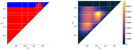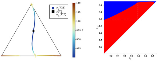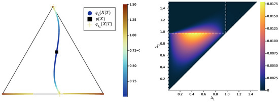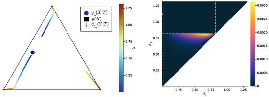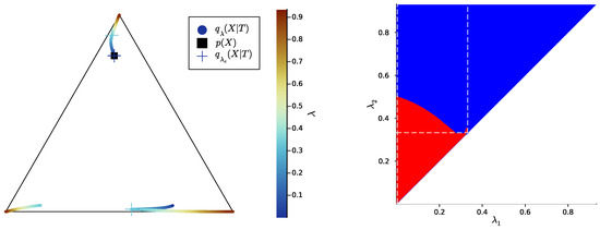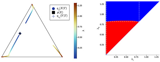where the complexity-relevancy trade-off is now parameterised by , which corresponds to the inverse of the information curve’s slope [41]. As the information curve is known to be concave, the Lagrangian parameter is an increasing function of the primal parameter . Moreover, we can, without loss of generality, assume that [43]. (Note that when the information curve is not strictly concave, the Lagrangian formulation does not allow one to obtain all the solutions to the primal problem [39,67]. However, in our simple numerical experiments, we always obtained strictly concave information curves.)