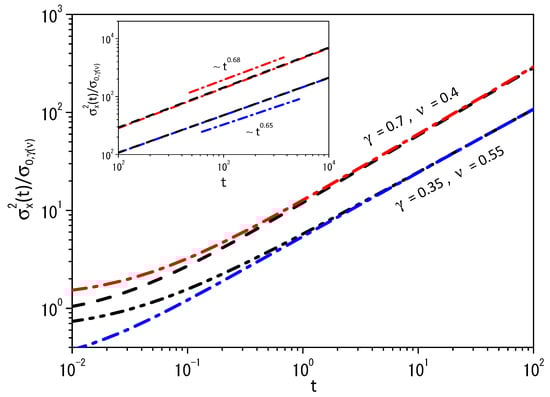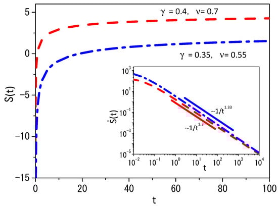 Figure 1 shows the behavior of the mean square displacement for two different sets of and in the absence of external forces. The values chosen for the parameters and are responsible for different behaviors of the mean square displacement for each case, as pointed out in the inset of Figure 1. In particular, the diffusion present in this scenario is anomalous [51,52]. Figure 2 shows the behavior of Equation (41) for two different sets of and . Note that different values of and used to obtain Figure 1 and Figure 2 are connected to different initial conditions for each subsystem. This is the reason why we initially verified different behaviors for each set of the parameters and , and, after some time, the mean square displacement has the same time dependence for both subsystems. The entropy production is shown in the inset in Figure 2, which corresponds to the behavior of Equation (61) for the entropy given by Equation (41). We underline that the system composed of these two systems reaches equilibrium in the limit of , since in this limit . For general nonlinear Fokker–Planck equations, the entropy should simultaneously satisfy the following equations,