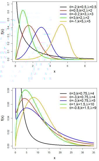The TLW model’s pdf is shown in Figure 1 for various values of , and . Figure 1 illustrates how the TLW distribution’s density function is flexible and changes in shape depending on the parameter values.