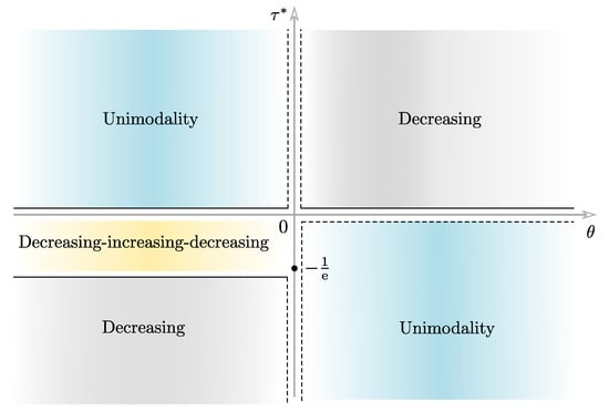 A simple calculation shows that the function is increasing (respectively, decreasing) when (respectively, ). Furthermore, notice that the function reaches the minimum value at . Using the graphs of the functions A and , and varying the parameters and , we can find the points of intersection of both graphs. Therefore, we can compactly classify the number of roots of Equation (16), as indicated in Table 2.