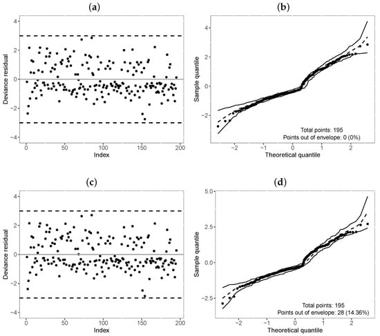 Index plot and normal probability plot with envelope of the deviance residual from the fitted regressions model to the COVID-19 data. (a,b): -TLW; (c,d): -Weibull.