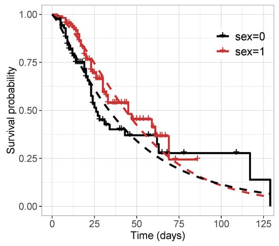 Kaplan–Meier survival curve and estimated survival functions from the -TLW by sex.