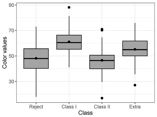 In this application, we consider the regression model for uncensored data. These data refer to Musa acuminata banana species from a banana plantation in the Philippines. A total of banana tiers were chosen randomly, in which the numerical values of the RGB colors (red, green, and blue) were obtained from images taken by hardware of four banana classes, extra class, class I, class II, and reject, where the classes contain 65, 49, 30, and 50 samples, respectively. The dataset is available in the repository: https://data.mendeley.com/datasets/zk3tkxndjw/2 (accessed on 20 May 2023) and more details can be seen in [30]. Each banana tier sample was captured with a white background in six different views: front, back, left, right, top, and bottom views. Here, we consider the values of B in front view. Figure 8 displays a boxplot by class, it is possible to observe differences between the colors according to the class.
