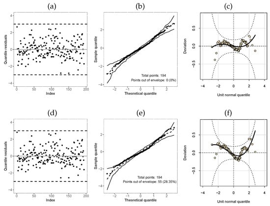 Index plot, normal probability plot with envelope, and worm plot of the quantile residuals from the regression models fitted to the Post-harvested dataset: (a–c): -TLW; (d–f): -Weibull.