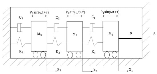 Vibroimpact systems often involve multiple impacts with rigid barriers, and the model represented by differential equations with constraints is referred to as the classical impact model. A schematic of the three-degree-of-freedom vibroimpact system with unilateral rigid constrain [] is shown in Figure 1. The stiffness coefficients of the three springs are . Three masses are attached to the wall using these three springs. Simultaneously, three linear dampers with damping coefficients, , are connected to the masses at the same time. Above every mass, there is a harmonic excitation force, . When the first mass, , moves the distance of , it will impact with the rigid barrier, . The energy loss during the impact is determined using the restitution coefficient.