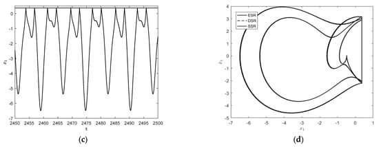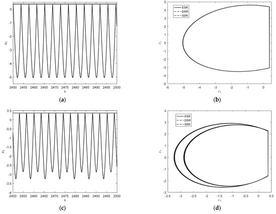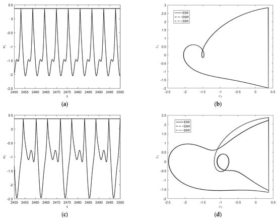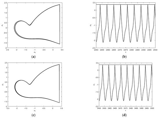 To further observe the dynamical behaviors of the three systems, Figure 4 shows the responses when and . As shown in Figure 4a,b, the system exhibits a stable symmetric motion at , which is close to the motion form of simple harmonic motion. When , a motion has period-doubling bifurcation and becomes a stable period motion, as shown in Figure 4c,d.