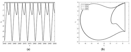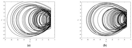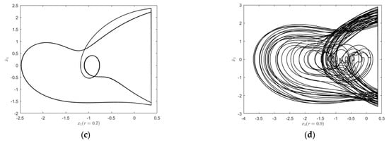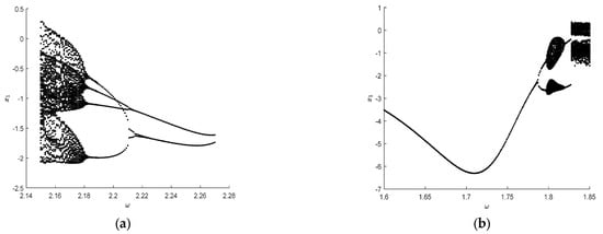 As can be seen from Figure 7 and Figure 8, when other parameters have been determined, as the angular frequency keeps decreasing, the system responses produce an abundant period-doubling bifurcation phenomenon in the process from to , and finally lead to chaos. The numerical simulation results show that the phase diagrams of the three systems agree well with each other in the path from period-doubling bifurcation to chaos, which reflects the evolution process of the system.