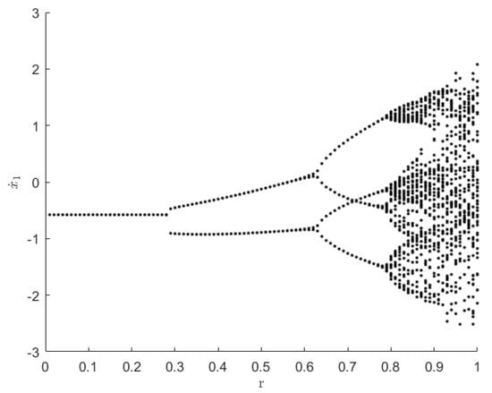 In the stochastic three-degree-of-freedom vibroimpact system, Equations (1) and (2), the restitution coefficient, , represents the energy loss in the impact process, which will further affect the periodic phenomenon of the system and lead to bifurcation. The parameters are considered as follows: , , and . The bifurcation diagram with respect to the restitution coefficient, , for a deterministic three-degree-of-freedom vibroimpact system is shown in Figure 9. Note that is Newton’s restitution coefficient, and its value range is 0 to 1. The smaller the restitution coefficient, the greater the energy loss of the system. From the figure, it is obvious that the system response experienced an evolution from period-doubling bifurcations to chaos with a restitution coefficient change. The critical point for the first bifurcation is at ; the second bifurcation occurs at ; and when , the system becomes chaotic.