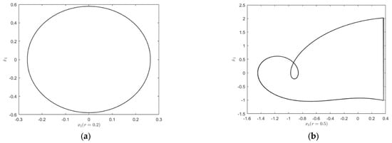 To clearly show the influence on the system responses for different restitution coefficients, the phase diagrams are presented in Figure 10. Different restitution coefficient values are chosen to see the changes of the system responses. Since smaller restitution coefficient can induce larger energy loss during the impact of the system, the system will become stable more easily for smaller restitution coefficients. As shown in Figure 10a, when , the energy left by the system is not large enough to reach the position of the rigid barrier, so a motion state similar to simple harmonic motion will be formed. When , the first block has the energy to reach the constraint surface, and the impact phenomenon occurs as shown in Figure 10b. In this case, one impact occurs for one period. When , the system exhibits a period-doubling response, as shown in Figure 10c. When , the system enters a chaotic state, as shown in Figure 10d.