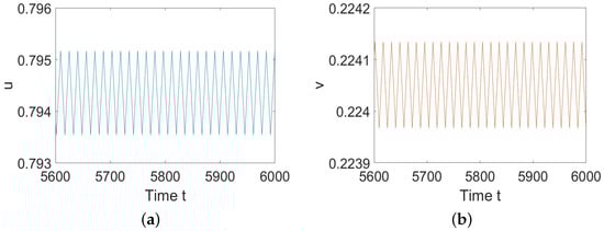 System (5) has stable periodic solutions. (a) represents the prey u, and (b) represents the predator v.