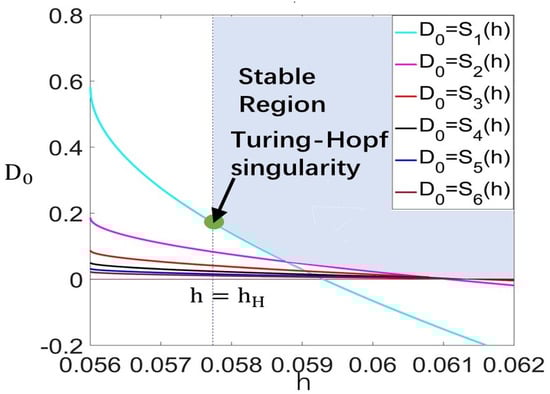 When intersects the critical Hopf bifurcation curve at , system undergoes the Turing–Hopf bifurcation at as