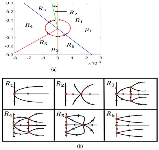 Then, we obtain the bifurcation diagram in the plane and the corresponding phase portraits of system (28) in the plane, as shown in Figure 3. Clearly, the above curves divide the plane into six regions, denoted as (see Figure 3). The existence and stability properties of the steady states in the six regions are listed in Table 1.