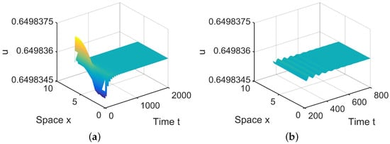 In , there are four equilibria, , , and in (28). Since and are stable, there exist spatially inhomogeneous periodic solutions; see Figure 6.