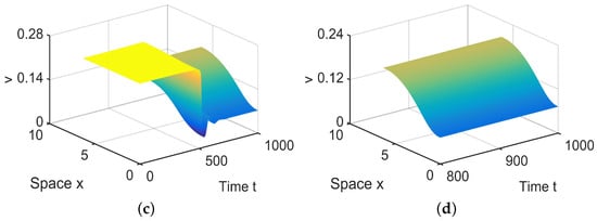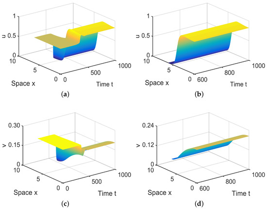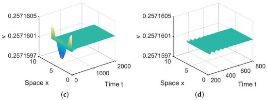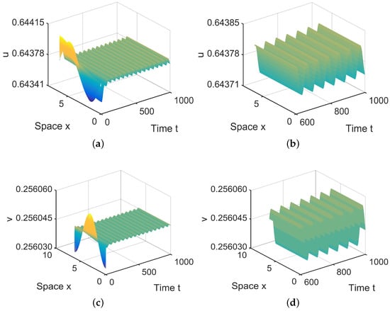 When = (−0.000003, −0.1) lies in , system (4) has spatially inhomogeneous steady states. (a,b) represent the prey u, and (c,d) represent the predator v. The initial values are chosen as and in (a–d). (b,d) are long-term behaviors for u and v, respectively.