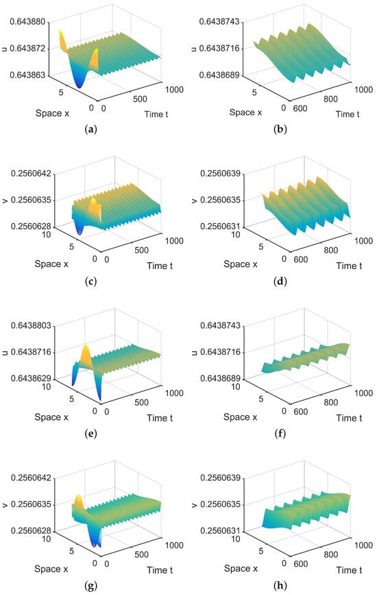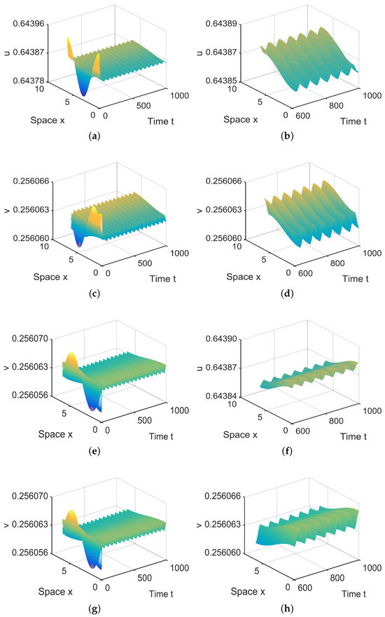 When = (−0.000003, 0) lies in , system (4) has two spatially inhomogeneous periodic solutions. (a,b,e,f) represent the prey u, and (c,d,g,h) represent the predator v. The initial values are and in (a,d) and and in (e,f). (b,d,f,h) are long-term behaviors for u and v, respectively.