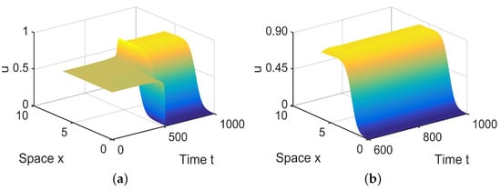 In , there are four equilibria, , , and , in (28). Since and are stable, there exist spatially inhomogeneous steady states; see Figure 8.