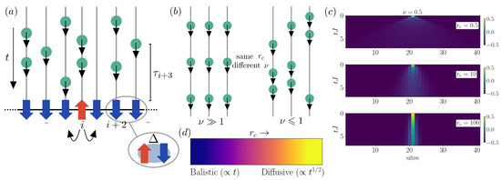 Concept of the model. (a) Diagram of an anisotropic spin chain with exchange rate J and interaction strength subject to stochastic collisional noise. Over time, individual ancillas (green circles) collide with individual spins in the chain with characteristic times ; (b) The noise distribution governing the collisions in Equation (3) can be tuned to be strongly space and time heterogeneous. In particular, on the left-hand side we observe temporal and spatial homogeneity due to the high values of , while on the right-hand side, for small values of , we have strongly temporal heterogeneity; (c) Time evolution of the local magnetization , depicting the spreading of the initial excitation (spin defect at the central site) as we increase the collision rate (top to bottom) with a fixed shape parameter (time homogeneous noise) for a system with spins. We observe that, similarly to the case of Markovian dephasing, the spreading velocity decreases with the increasing dissipative rate. (d) Phenomenology of transport slowdown due to dephasing between the ballistic regime (), where the system presents linear spreading and a diffusive regime (, leading to slower propagation , both appearing at long times/distances in Markovian dynamics.