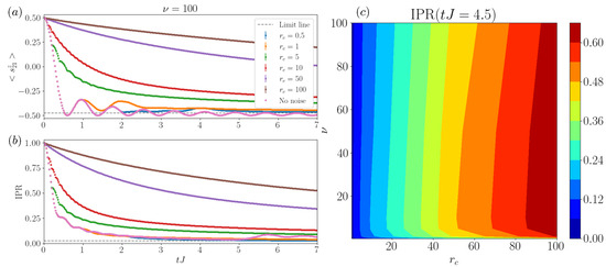 where i represents the site index and represents the single-excitation localized states [33]. Thus, IPR is bounded between the complete delocalization asymptotic value , and , corresponding to complete localization, i.e., when the excitation remains on a particular site of the network [38]. Therefore, the larger the , the more localized the excitation is over the lattice. We generally expect that, in the absence of dissipation, long-lasting Bloch oscillations will set in, while in the long-time limit in the presence of dephasing, the excitation will spread over the lattice and coherence will disappear, tending toward a configuration where the excitation is completely delocalized over the chain. Thus, the rate at which we approach this state—and consequently the evolution of the IPR—strongly depends on the noise parameters.