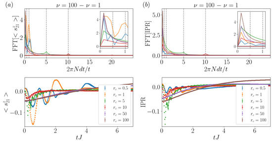 In order to understand the coherent behavior observed in the time signals, in Figure 3, we analyze the spectrum via the fast Fourier transform (FFT) of both the local magnetization time evolution (Figure 3a) and the IPR time evolution (Figure 3b), to characterize the oscillatory effects. In particular, in our analysis, we subtract the time-heterogeneous from the time-homogeneous signal for the same collisional rate and search for the main frequencies of the system, removing the DC component. From this procedure, we can observe coherence-driven oscillatory behaviors in the system, with frequencies that vary with and seemingly independent of . As we increase , oscillations are washed out by the lack of coherence, and the strong damping of the dynamics making the main peak, always at frequency , becomes smaller. However, this peak still corresponds to the main frequency, apart from the DC component and some spurious effects at low frequencies.